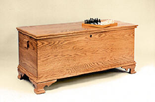 The differences between the Regular Flat Top and the Reproduction Flat Top are the foot on the Reproduction is an "Ogee" and the lid has a little bit more detail in the trim. The Reproduction is only available in Oak and Cherry in our Medium and Standard sizes. Sizes - All chests are standard with lock and key Prices